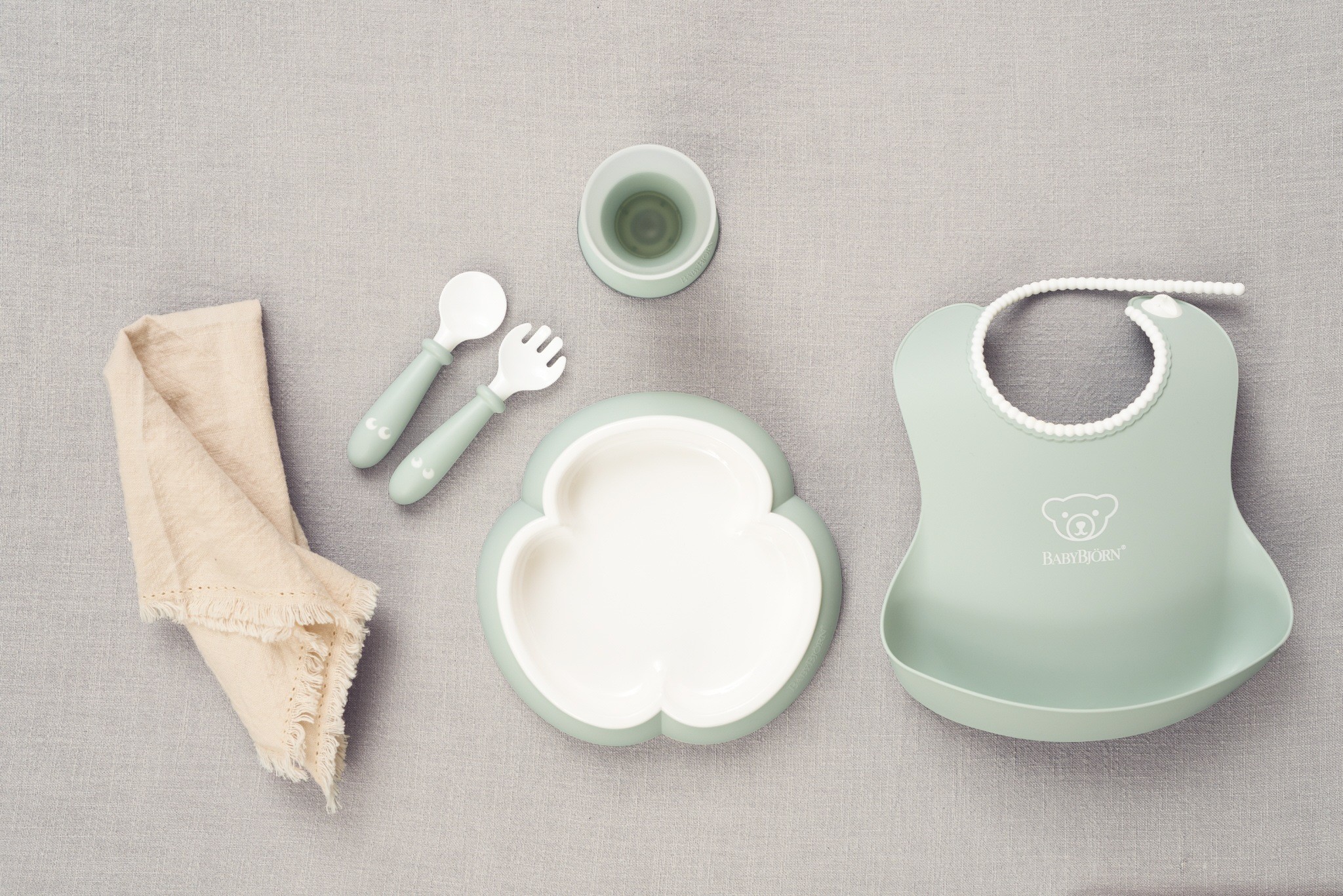 Set pribora za jelo osmišljen za najmlađe ljubitelje hrane. Neklizajući tanjur u obliku trolista, pribor s kratkim ručkama pogodnim za držanje i čaša koja se lako drži pojednostavljuje hranjenje i zabavlja vaše dijete. Mekani slinček ima duboki džep za izlijevanje da bi uhvatio bilo koju hranu koja ne ulazi u bebina usta. Manje neuredni obroci za sve!